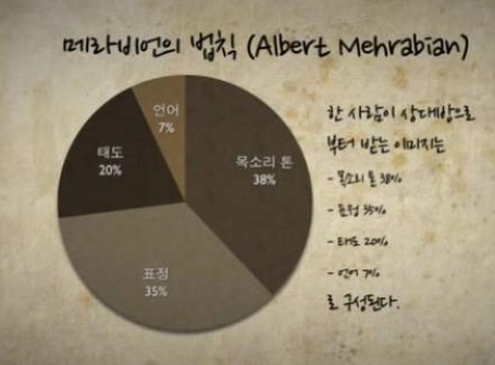 ๋ฉ๋ผ๋น์ธ์ ๋ฒ์น์ด๋ ์๋๋ฐฉ์ผ๋ก๋ถํฐ ์ ๋ฌ๋ฐ๋ ๋ํ์ ์ด๋ฏธ์ง๋ ์๊ฐ์ด 55%, ์ฒญ๊ฐ์ด 18%, ์ธ์ด๊ฐ 7%'๋ผ๋ ์ด๋ก ์ผ๋ก, ๋ํ ์์ ์ธ์ด์ ์ธ ํํ์ผ๋ก ์ธํ ๋ง์ ๋ด์ฉ์ 7% ์ ๋๋ฐ์ ์ ๋ฌ๋ ฅ์ด ์๊ณ , ๋๋ถ๋ถ ์ฐ๋ฆฌ๊ฐ ์ธ์งํ์ง ๋ชปํ๋ ๋น์ธ์ด์ ์์๋ค์ ์ํด์ ๋ด์ฉ์ด 93%๋ ์ ๋ฌ๋๋ค๋ ๊ฒ์ด์ฃ .