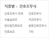 ์ง์ข ๋ณ๋ก ๊ฐํธ์กฐ๋ฌด์ฌ๋ (๊ฐํธ์กฐ๋ฌด์ฌ ์ ์ฒด, ์์ ์ค ๋ณด์กฐ, ์น๊ณผ์กฐ๋ฌด์ฌ, ํ์์ ์ง๋ฃ๋ณด์กฐ, ์ง๋ฃ๋ณด์กฐ) ๋ฑ์ผ๋ก ๋๋ ์ ธ ์์ต๋๋ค.