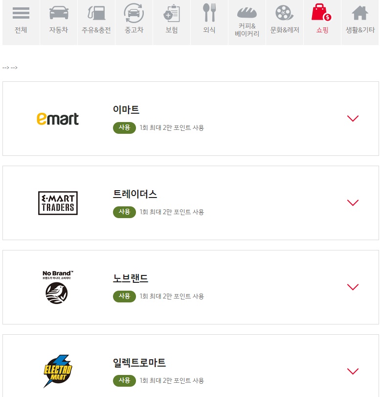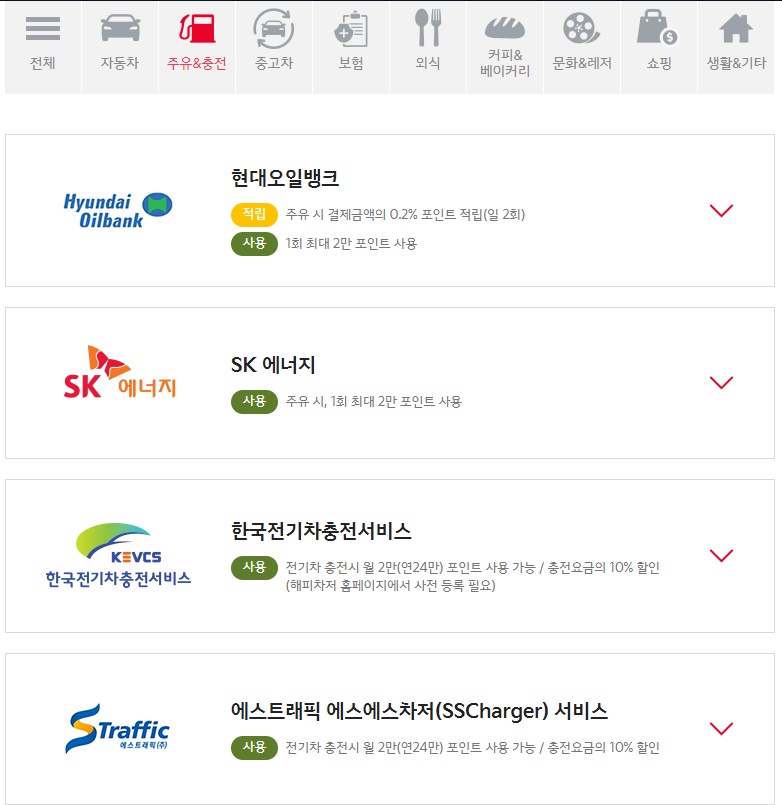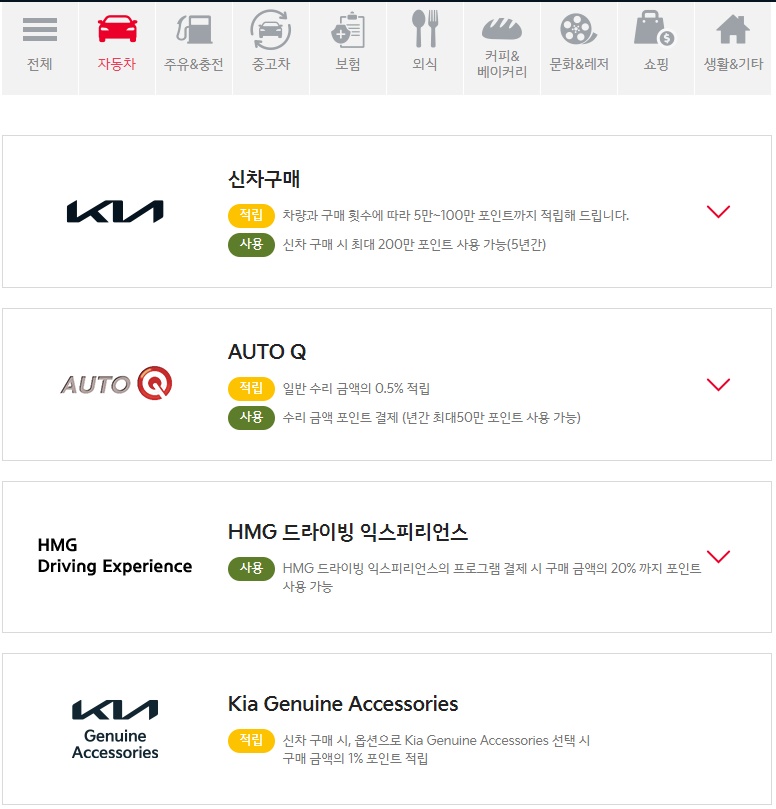 1) ์ฐจ๋ ๊ด๋ จ ํฌ์ธํธ ์ฌ์ฉ - ๊ธฐ์์๋์ฐจ ์ ์ฐจ ๊ตฌ๋งค ์, ์คํ ํ ์ ๋น ์, ํ๋ ๋๋ผ์ด๋น ์ต์คํผ๋ฆฌ์ธ์ค ํ๋ก๊ทธ๋จ ๊ฒฐ์ ์ , ๊ธฐ์ ์ง๋์ด์ค ์